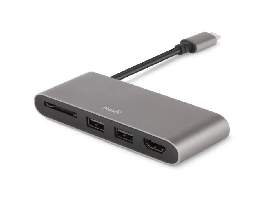 Moshis USB-C zu 2 x USB-A Adapter ist ein geschmeidiger mobiler Adapter, der zwei zusätzliche USB 3.1 Gen 1 Ports für Ihr USB-C MacBook bietet. Sie können mit diesem Adapter jedes standardmäßige USB-Gerät wie eine externe Festplatte, eine Tastatur, eine Maus oder einen Drucker anschließen. Beide Ports bieten Hochgeschwindigkeits-Datenübertragung (bei bis zu 5 Gbps) und unterstützen ebenfalls das Laden angeschlossener Geräte. Das eloxierte Aluminiumgehäuse des Adapters minimiert nicht nur EM-Störungen, sondern ergänzt Ihr MacBook außerdem perfekt.