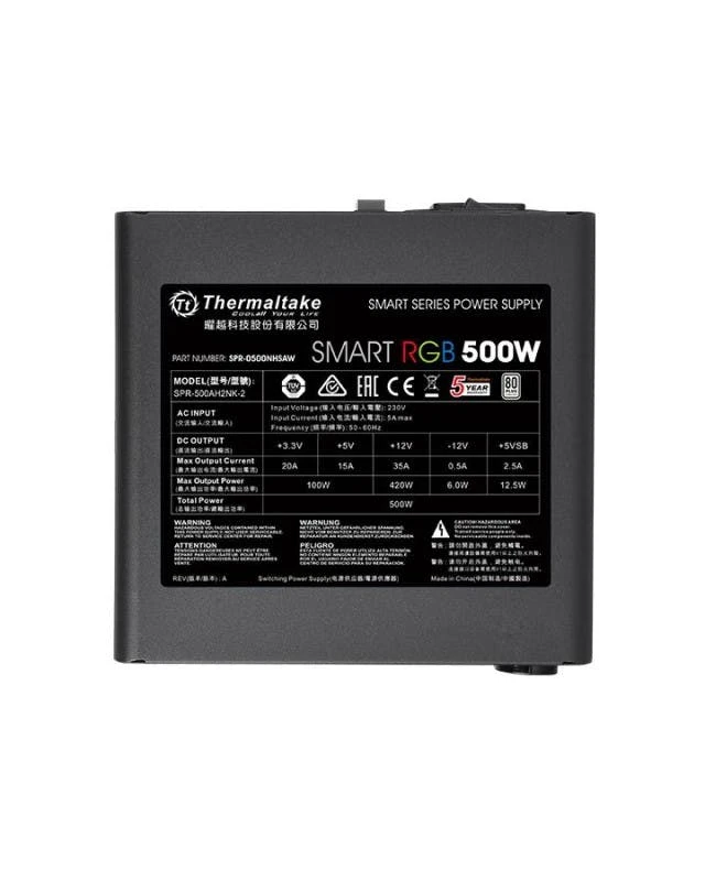 Produktbeschreibung: Thermaltake SMART RGB PS-SPR- 5 NHSAWE-1 – Netzteil – 5 Watt Gerätetyp: Netzteil – aktive Power Factor Correction (PFC) – intern Spezifikationseinhaltung: ATX12V 2.3 8 -PLUS-Zertifizierung: 8 PLUS Eingangsspannung: Wechselstrom 23 V Ausgangsspannung: +3.3, +5, ±12 V Leistungskapazität: 5 Watt Ausgabeanschlussstellen: 1 x Stromversorgung: ATX, 24-polig ¦ 1 x Strom 8-poliges EPS12V mit abnehmbarem 4-poligem ATX12V-Bereich ¦ 2 x 8-poliger PCI Express Power mit abnehmbarer 2-poliger Sektion ¦ 4 x interne Stromversorgung, 4-polig ¦ 5 x 15-Pin-SATA-Stromstecker ¦ 1 x 4-Pin-Mini-Stromversorgungsstecker Kühlsystem: 12 -mm-Lüfter Farbe: Schwarz Abmessungen (Breite x Tiefe x Höhe): 15 cm x 14 cm x 8.6 cm