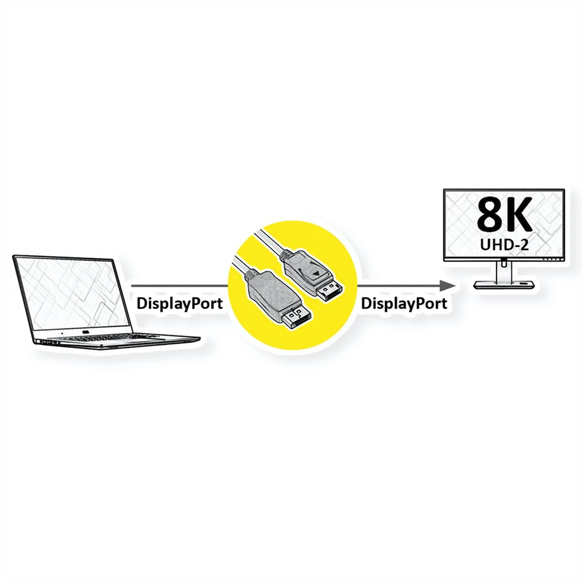 ROLINE DisplayPort Kabel mit beidseitigem DP-Anschluss für das Verbinden eines Ultrabooks, Notebooks/Laptops oder PCs mit einem Monitor, TV, Beamer oder Projektor – für Bildschirmübertragungen in exzellenter Qualität mit einer 8K Auflösung von bis zu 7680×4320 @60Hz!