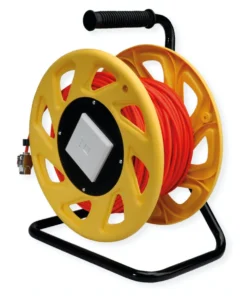 60 Meter Twisted Pair Installationskabel zum Abrollen bei Bedarf. Kabel der Kat. 7 für den Einsatz in 10-Gigabit-Ethernet-Netzwerken auf Kabeltrommel. Integrierte RJ-45 Datendose (Kat.6A) mit Schutzkappe. Kat.6A-Keystone-Buchse (RJ-45) am Ende des Kabels. Doppelt geschirmtes (PiMF) Kabel. Impedanz: 100 Ohm. Kabelfarbe: orange. Aufbau: 8 Adern, Kupfer, Massivdraht AWG26. Paarweise Schirmung in alu-kaschierter Folie. Gesamtabschirmung in verzinntem Kupfergeflecht