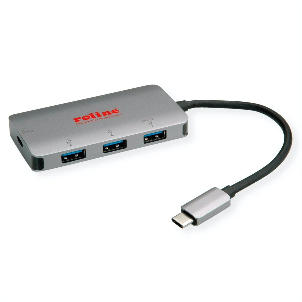 Drei USB 3.0 / USB 3.2 Gen 1 Anschlüsse (Typ A Buchsen) für SSDs/HDDs, USB Sticks oder Peripheriegeräte. Max. 5 Gbit/s Datenübertragungsraten. 1 Port USB Typ C PD (Power Delivery) Buchse. Mattgraues Aluminiumgehäuse.