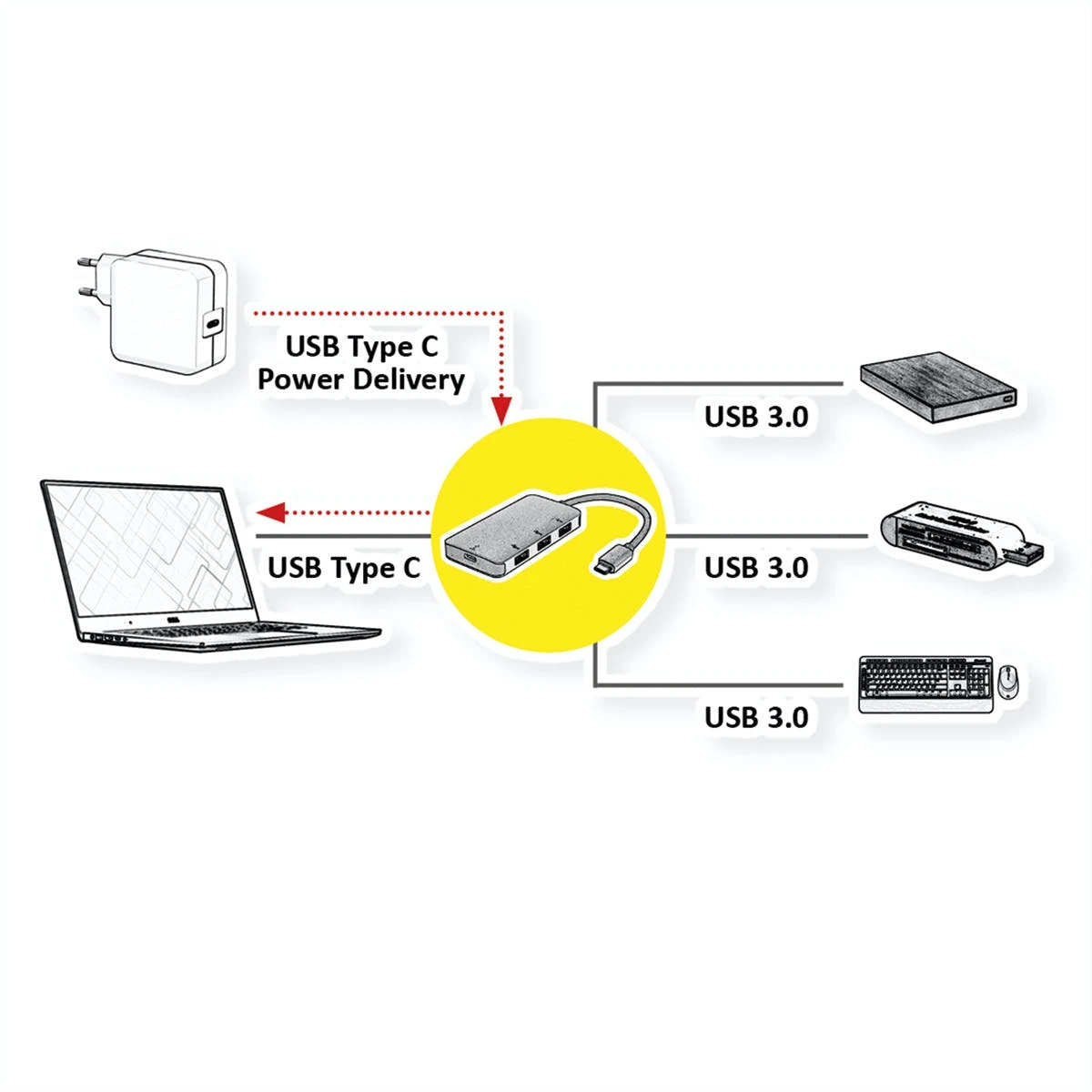 3-Port USB 3.0 / USB 3.2 Gen 1 Hub mit USB Typ C Anschlusskabel und zusätzlichem USB Typ C PD (Power Delivery) Port – geeignet für MacBooks, Ultrabooks, Notebooks/Laptops, PCs oder auch für mobile Geräte.